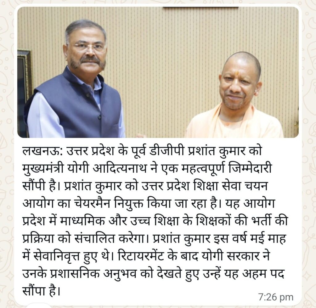 शिक्षा सेवा चयन आयोग के नए अध्यक्ष के रूप में श्री प्रशांत कुमार जो कि उत्तर प्रदेश के पूर्व डीजीपी के रूप में कार्यरत थे और हाल ही में मई महीने में यह रिटायर हुए हैं जिसकी वजह से योगी सरकार ने उनके कार्य और अच्छे और ईमानदार कार्यों को देखते हुए इनको शिक्षा सेवा चयन आयोग का अध्यक्ष के रूप में नियुक्ति किया है जो कि अब यह आने वाली सभी शिक्षक भर्तियां यही देखेंगे ।